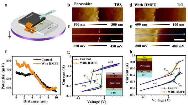a)KPFM测量的示意图。 b-e)标件和HMFE掺杂的钙钛矿薄膜在TiO2和钙钛矿层的异质结构界面处的b,d)AFM形貌和c,e)表面接触电势差。比例尺:2 μm。 f)沿c,e)中橙色和蓝色箭头的表面接触电势差。 g)电子和h)空穴缺陷态密度和迁移率的暗I–V测量值。插图分别显示了纯电子和纯空穴器件的结构示意图。