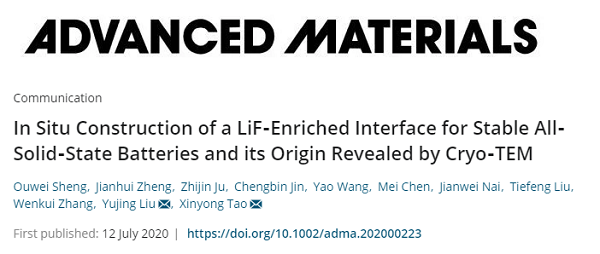 文献链接:In Situ Construction of a LiF-Enriched Interface for Stable All-Solid-State Batteries and its Origin Revealed by Cryo-TEM, Adv. Mater. 2020, 2000223. DOI: 10.1002/adma.202000223.