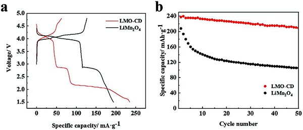 (a)LMO-CD和普通LiMn2O4在电流密度为50 mA g-1且电压窗口为1.5-4.8 V时的第一圈充/放电曲线;