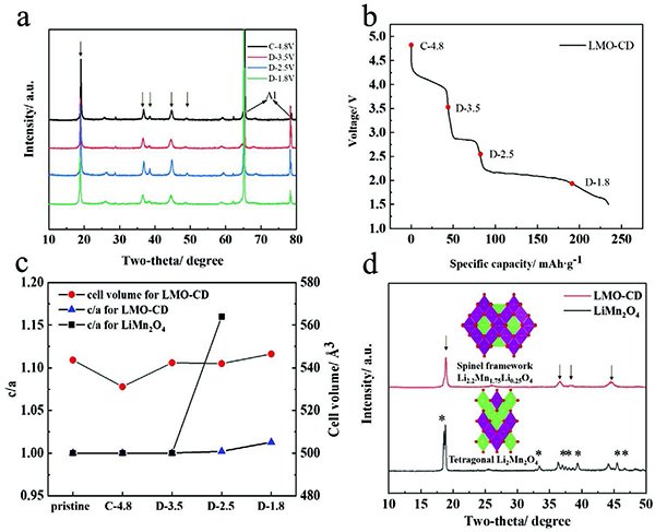 (c)在不同的充放电电位下,LMO-CD和普通LiMn2O4的电池体积和c/a变化;