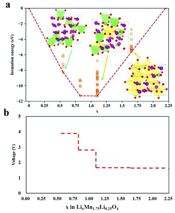 (a) 考虑的所有构型的形成能(橙色空心圆)和用于Li2.115(Mn0.085)T(Li0.335Mn1.665)OO4(橙色线)的形成能;