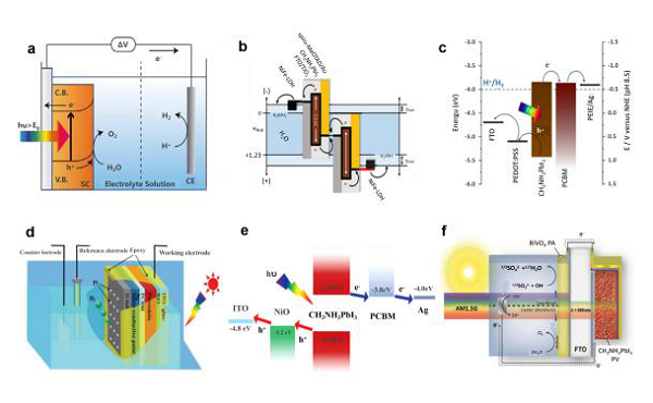 水裂解是实现太阳能向化学能转换的有利手段。HOIPs于2016年首次应用于制氢领域。MAPbI3展现出极具潜力的光电和光催化性能,具有超高的能量转换效率。文章总结了三种提高催化性能的方法:采用MAPbBr3–xIx作为带隙漏斗结构,用HX(X=Cl,Br,I)的光催化裂解代替水裂解制氢(图4 c,d),采用异质结结构(图4 f-j)。光和电驱动的光催化(PEC)反应系统也被用于水裂解析氢(图5)。