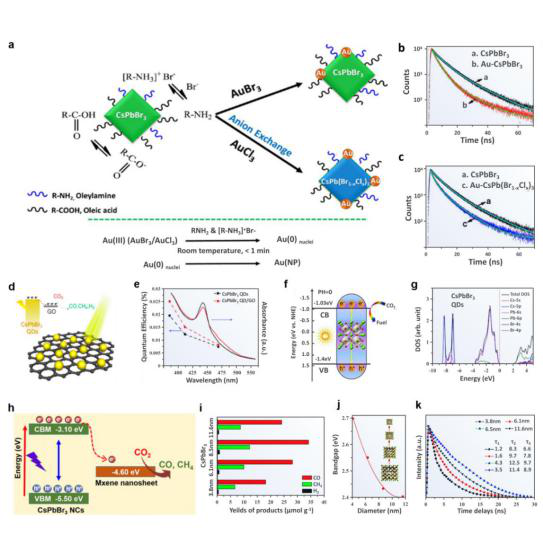 由于光催化二氧化碳可以得到高能量密度燃料且可以解决二氧化碳浓度上升的问题,光催化CO2还原技术引起了广泛关注。文章指出引入rGO(图6 d,e)或 2D MXene对于二氧化碳的还原具有促进作用,这两种2D材料不仅促进了电荷的分离,还在储存电子方面发挥了关键作用;卤化物钙钛矿量子点具有更大的比表面积和更短的电荷转移路径,从而提高了催化性能,同时对二氧化碳的还原机理和能带结构(图6 f-k)进行了深入的了解并解释了上述现象。
