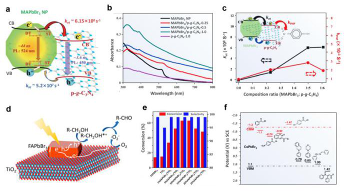 发展光催化净水技术对保护水源具有重要意义,异质结结构结合了两种材料的多种特性,除rGO、GO和TiO2外,另一种层状半导体g-C3N4因其具有高的化学稳定性和热稳定性、较大的比表面积和极佳的光催化性能也被应用于与卤化物钙钛矿形成异质结(图7a-c)。同时文章指出卤化物钙钛矿还可以用于氧化有机物和有机物的合成(图7 d-f)。