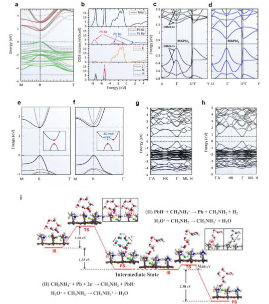 目前,许多光催化的计算研究都是针对载流子的迁移率、有效质量、寿命等电子性质。文章介绍了几种机器学习算法:准粒子自洽(QSGW)用于初步确定合适带隙的一种计算方法(图8 a)并将其与局部密度近似法(LDA)进行了对比;DOS 用于了解有机和金属部分对导带和价带的影响(图8b)。同时文章对未来的计算研究进行了展望:自旋轨道耦合(SOC)的应用(图8 c,d),将机械计算应用于更多种类的有机物(图8 e,f),杂化钙钛矿光催化机理的计算研究(图8 i),双钙钛矿的计算研究(图8 g,h)。