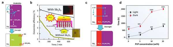 尽管钙钛矿型太阳能电池(PSCs)的效率近年来有所提高,但其固有的不稳定性限制了进一步的发展。本文阐述了太阳辐照下钙钛矿降解的可能机制并总结了两种提高稳定性的方法:在TiO2与CH3NH3PbI3的界面引入Sb2S3,CH3NH3PbI3钙钛矿与聚合物(聚乙烯吡啶烷酮,PVP)基体结合(图9 b-d) 。