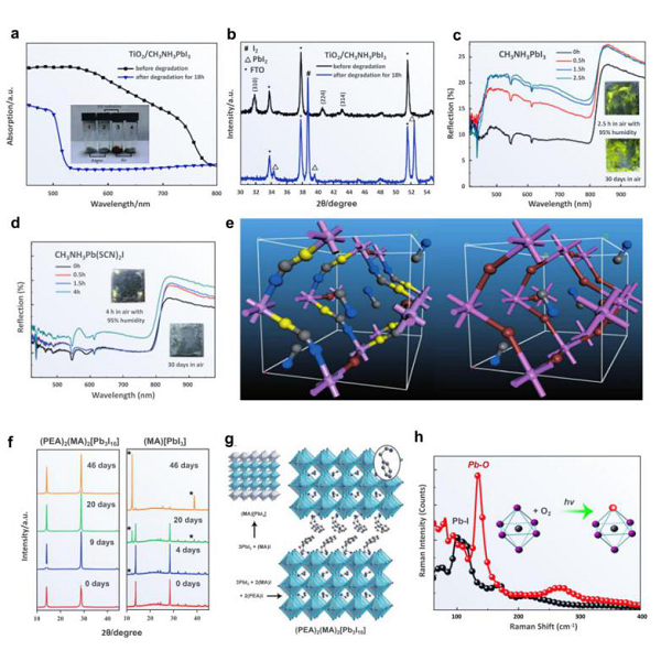 文章以CH3NH3PbI3为例,讲解了卤化物钙钛矿的两种降解过程和表面的氧插层现象,并解释了氧在激光激发下嵌入MAPbI3结构的机理(图10 h),指出在MAPbI3表面嵌入氧可以显著提高材料的稳定性,根据上述降解机理研究人员提出了三种提高卤化物钙钛矿稳定性的方法:引入有机基团,用硫氰酸盐离子(SCN–)取代卤化物(图10 c,d),应用二维混合钙钛矿(图10 f,g)。