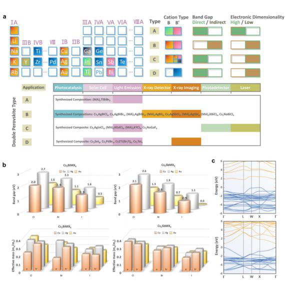 Pb2+的毒性阻碍了卤化铅钙钛矿的大规模生产和商业应用。因此,寻找具有类似于卤化铅钙钛矿光电性质的低毒材料将使该领域取得重大进展。文章对比了三种可以用作替代Pb2+的离子:Sn2+,Ge2+ 和Bi3+(图11 a-e)。在过去的几十年里,双钙钛矿(A2BB’X6)由于其中的B/B’位的阳离子的多样性使其可以对晶格和电子结构进行修改和控制。到目前为止,已经用不同种类的B和B’阳离子(如B=Li+、Na+、K+、Rb+等,以及B’=In3+、Tl3+、Bi3+、Sb3+等)合成了四种双钙钛矿,图12总结了几乎所有的双钙钛矿结构路线、合成成分和电子性质以及潜在应用。