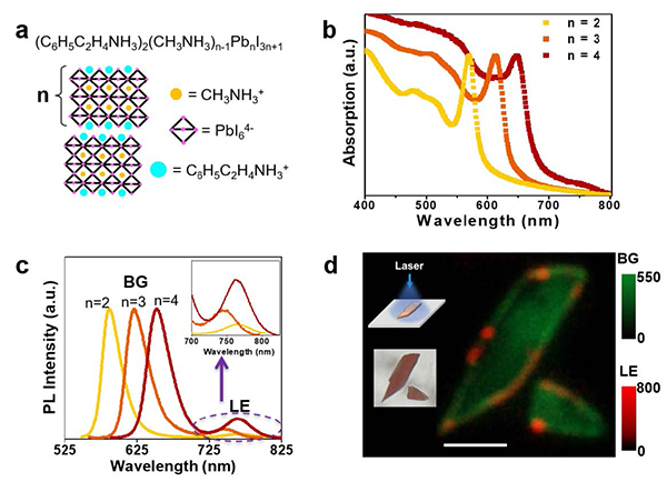 图一、二维钙钛矿晶体的光谱和微区荧光成像(a)(PEA)2(MA)n-1PbnI3n+12D钙钛矿晶体结构示意图;