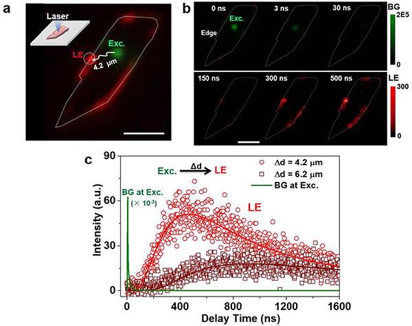 图二、 时间分辨PL图像和动力学揭示二维钙钛矿晶体(n=3)中的长距离载流子输运(a)在聚焦激发下,相同晶体的微区PL强度图像;