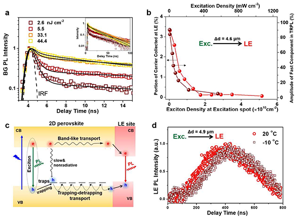 图三、层状二维钙钛矿中的载流子输运机理(a)在典型的n=3钙钛矿晶体中,在不同激发强度下,在15 ns的时间窗口内,BG激子的TRPL动力学;