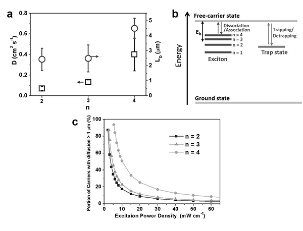 (c)计算了在不同激发功率密度下,n=2、3和4二维钙钛矿中能扩散≥1μm的载流子比例;