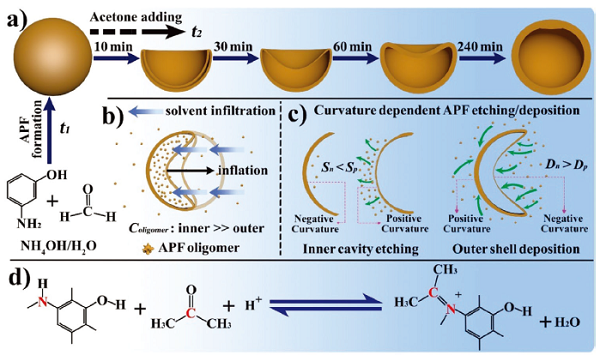 昆士兰的大学的Hao Song和余承忠(共同通讯作者)团队提出了一种紧缩—膨胀非对称生长(DIAG)策略,能够产生用于界面催化的凹面空心结构。具有较低内部交联度的氨基苯酚-甲醛(APF)纳米球经过丙酮刻蚀可以得到完全紧缩的纳米碗结构。研究认为在单个颗粒中的刻蚀和重聚合过程是非对称的,因此可以观察到自发的膨胀现象,这与篮球的充气过程颇为相似,但在纳米尺度却非常少见。而这一现象的化学起因则被进一步归结为丙酮和APF之间的亲核加成反应。更有趣的是,紧缩的APF空心纳米球有利于脂肪酶在空腔中的固定,使得Pickering液滴更加稳定,从而可以增强油水界面的酶催化反应。这一研究为设计空心纳米颗粒提供了不同的理解,也为非对称结构的应用开拓了新的思路。
