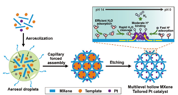大连理工大学的王治宇和邱介山(共同通讯作者)报道了一种新型多级(multilevel)空心MXene。研究利用模板介入的气溶胶干燥策略组装MXene形成具有导电、亲水、化学功能化多级空心结构的三维构造。在这一空心结构中,足够的扩散通道、多活性表面区域、具有高导电和抗聚集能力性的刚性框架等与超细铂协同创造了高效多功能催化界面。在全pH范围内,该新型催化剂的析氢质量活性要比商用20%铂/碳高出10-20倍,特别是在碱性电解质中,质量活性最高可以达到12.94A/mgPt。