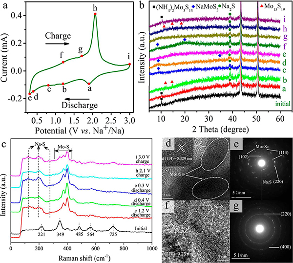 (b,c)在充/放电到不同的电压下,(NH4)2Mo3S13电极的XRD和拉曼光谱。
