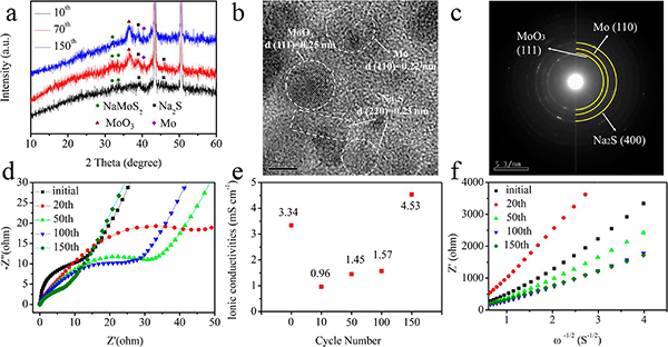 (a)在10、70和150个循环后,在完全充电状态下测试(NH4)2Mo3S13电极的非原位XRD谱图。