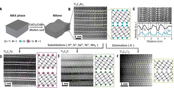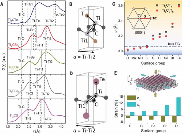 近日,美国芝加哥大学Dmitri V. Talapin教授(通讯作者)介绍了通过在熔融无机盐中进行取代和消除反应来重修饰和消除表面基团的一般策略,从而实现了在MXene上修饰O、NH、S、Cl、Br、Se和Te端基。使得这些不同组分的MXene材料展现出了不同的结构和电子特性。具体来讲,表面基团控制MXene晶格中的原子间距离,未应变的碳化钛晶格相比,以碲化物(Te2–)配体修饰的Tin+1Cn(n= 1,2)MXenes 表现出巨大的(> 18%)界面晶格扩展。此外,在Nb2C相应的MXenes材料中发现了低温区超导性的现象,这主要得益于表面修饰作用对晶格轴应力、声子频率、电子-声子耦合强度的调控使得MXene材料表现出了超导特性。相关研究成果以“Covalent surface modifications and superconductivity of two-dimensional metal carbide MXenes”为题于2020年8月21日在线发表于Science上。