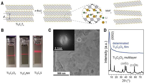 众所周知,二维(2D)过渡金属碳化物和氮化物(MXenes)已经被广泛地研究用于超级电容器,电池,电磁干扰屏蔽,复合材料和催化剂。MXene通常由相应的MAX相合成,其中M代表过渡金属(例如Ti,Nb,Mo,V,W等),X代表C或N。其中,MXenes主要通过HF酸或盐酸和氟化物的混合溶液将MAX相中结合较弱的A位元素(例如Al,Ga,Si等)抽出而得到。它具有石墨烯高比表面积、高电导率的特点,又具备组分灵活可调,最小纳米层厚可控等优势。与其他2D材料(例如石墨烯和过渡金属卤化碳)的表面不同,这些官能团可以进行化学修饰。最近的理论研究预测,具有不同表面基团的MXene的选择性终止会展现出优异的特性,例如打开或关闭带隙,室温电子迁移率超过104 cm2/Vs,半金属性和2D铁磁性。二维过渡金属碳化物中表面官能团的多功能化学转化为这种广泛的功能材料开辟了以前未曾探索过的设计空间。