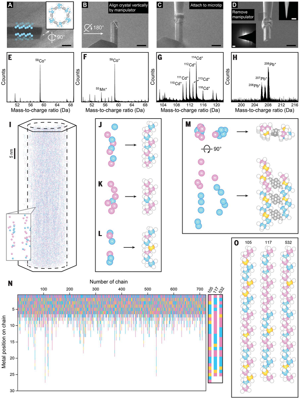 在使用APT绘制金属图时,必须知道深度(z轴,垂直方向)的空间分辨率约为0.2 nm,横向(xy平面)的空间分辨率为0.5到1 nm(图1)。后者的较低分辨率是由轨道像差和局部放大效应引起的,使原子在平面内的位置与真实晶格模糊地点。尽管如此,沿z方向的深度分辨率足够高,可以区分来自不同深度的原子。在这项研究中,作者利用了高深度分辨率的优势,沿着垂直于探测平面的六角棱镜晶体的最长尺寸对准MOF的棒SBU(图2A-D)。因此,金属氧化物棒SBU中的金属链受到沿测量z轴的金属序列“读数”的影响。通过使用双束聚焦离子束将最终MOF样品锐化为适合APT测量的尖端(直径<100 nm)(图2D,右上角插图),无结晶度损失,如通过电子衍射(图2D,左下角插图)确认的。