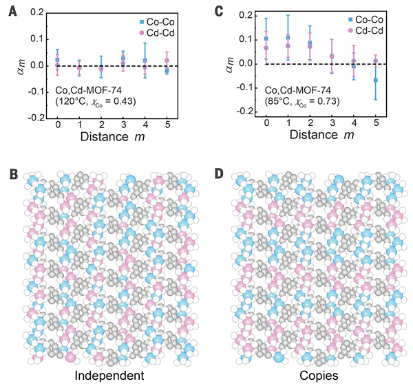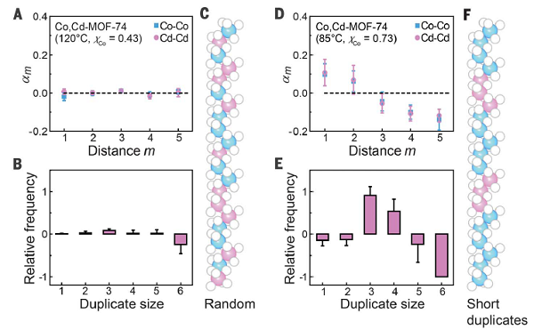 为了确定样品的序列类型,作者计算得到的重组链的PM-SRO参数。结果发现,Co,Cd-MOF-74(120 ℃)在不同距离下其值均接近于零(图3A),对应金属随机序列的存在(图3c)。通过直接计数得到的序列内重复大小的直方图与均匀分布模拟的序列一致(图3B)。