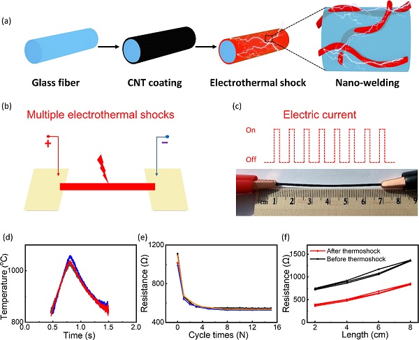 (c)带有两个电极的CNT涂层玻璃纤维长丝的照片图像,示意图显示了通过反复的电流开关实现的电热冲击。