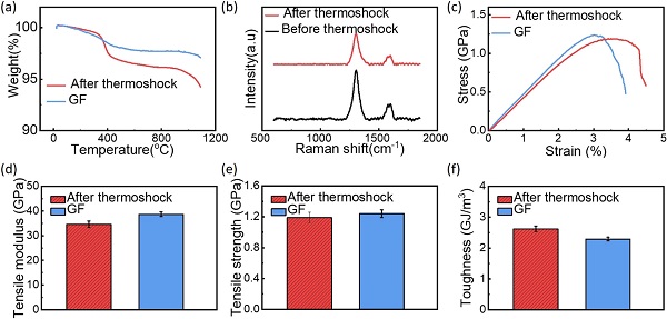 (d-f)纯玻璃纤维与焊接CNT/玻璃纤维的拉伸模量、拉伸强度和韧性的对比。