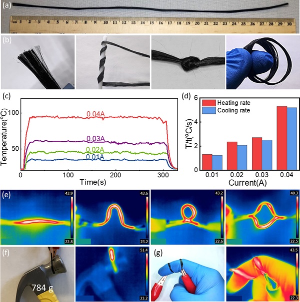 (g)缠绕在手指上的CNT/玻璃纤维焊接细丝的照片和红外图像,展示了其在可穿戴加热器件中的潜在应用。