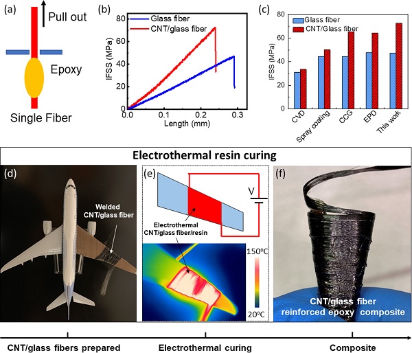 (b)玻璃纤维和CNT/玻璃纤维的界面剪切应力。