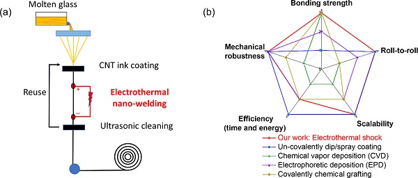 (a)焊接CNT/玻璃纤维的连续、连续生产的制造工艺示意图。