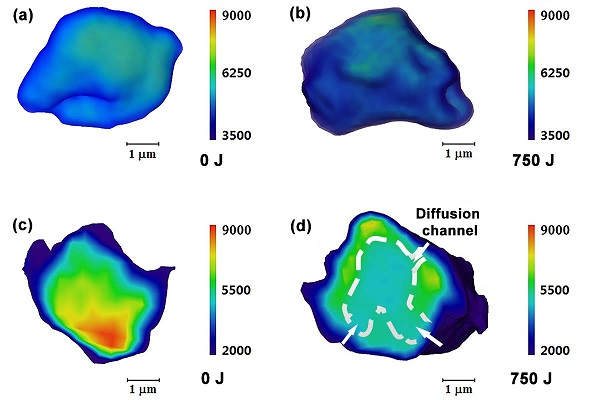 图 1. Nano-CT 结构重建:(a) 0 J 和(b) 750 J 两种能量超声振动 Fe78Si9B13 非晶合金颗粒表面形貌;(c) 0 J 和(d) 750 J 两种能量超声振动 Fe78Si9B13 非晶合金颗粒截面图。