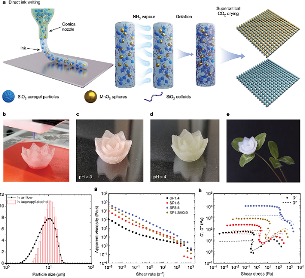 由于其超低的导热性和开孔结构,硅气凝胶被广泛应用于隔热、催化、物理、环境补救、光学器件和高速粒子捕获。绝热材料是硅气凝胶最大的市场,当空间有限时,硅气凝胶是理想的材料。硅气凝胶的一个缺点是脆性。纤维增强剂和粘合剂可以在建筑和工业绝缘的大范围应用中克服这一问题,但是它们的可加工性差,加上精确铸造小物体的不稳定性,限制了二氧化硅气凝胶小型化的潜力。在此,瑞士联邦材料科学与技术研究所Wim J. Malfait,Shanyu Zhao教授报道了一种直接油墨书写的增材制造方法,从稀释的二氧化硅纳米颗粒悬浮液(溶胶)中的硅气凝胶粉末浆液中构建微型硅气凝胶物。由于高体积分数的凝胶颗粒,墨水表现出剪切稀释行为。因此,在打印过程中,它们很容易通过喷嘴,但在打印后,它们的粘度迅速增加,确保被打印的物体保持其形状。印刷后,硅溶胶在氨气中形成凝胶,使后续处理成为气凝胶。印刷的气凝胶物体是纯二氧化硅,并保持典型的二氧化硅气凝胶的高表面积和超低导热性。此外,还演示了功能纳米颗粒可以很容易地结合在一起。打印的二氧化硅气凝胶对象可以用于热管理,作为小型气体泵和降解挥发性有机化合物。相关研究以“Additive manufacturing of silica aerogels”为题目,发表在Nature上。(DOI: 10.1038/s41586-020-2594-0)
