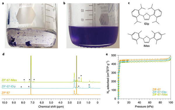 良好的分子腔和化学功能的结合使晶体多孔固体吸引了大量的技术应用,从催化到气体分离。然而,与聚合物等其他广泛应用的合成固体相比,结晶扩展固体缺乏可加工性阻碍了它们的应用。在这项工作中,阿卜杜拉国王HTH官网地址 大学Alexander Knebel 、Anastasiya Bavykina、Yury Lebedev等人证明了金属有机框架,一种高晶体多孔固体,可以通过使用氮杂环碳烯配体的外表面功能化溶液处理。相对较大的ZIF-67纳米颗粒(250 nm)的选择性外表面功能化可以稳定具有永久孔隙性的可加工分散体。所得到的III型多孔液体既可以直接作为液体吸附剂使用,也可以与最先进的聚合物共同处理,生成具有优异机械性能的高负载混合基质膜,在丙烯与丙烷的分离方面具有出色的性能。期望这种方法可以扩展到其他金属有机框架和其他应用。相关研究以“Solution processable metal–organic frameworks for mixed matrix membranes using porous liquids”为题目,发表在Nature Materials上。(DOI: 10.1038/s41563-020-0764-y)