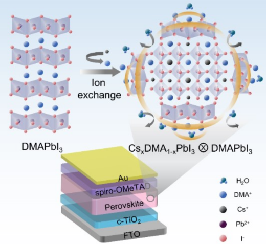 刘明侦研究小组证实了在DMF中溶解PbI2和HI不会产生HPbI3,而是水解产物DMAPbI3((CH3)2NH2+, DMA+),并对水解衍生材料(即DMAPbI3)进行深入研究,详细分析其在制备高效钙钛矿电池中的作用。通过改变前体中CsI/DMAPbI3的比例可以获得高质量CsxDMA1-xPbI3钙钛矿薄膜,该薄膜具有均匀的形貌、低的陷阱态密度和良好的稳定性,从而使功率转换效率达到了14.3%,这项发现为生产高质量Cs基钙钛矿材料提供了新见解。