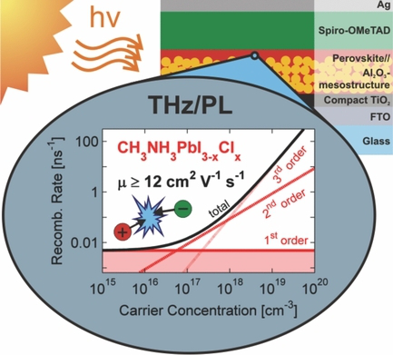Laura Herz小组发现有机铅卤化物钙钛矿材料CH3NH3PbI3和CH3NH3PbI3-xClx显示出接近10 cm2 V-1 s-1的高电荷载流子迁移率和低双分子电荷复合数,两者均比由郎之万电荷俘获动力学方程得到的极限值还高出四个量级以上,进而导致出乎意料的长载流子扩散长度(超过1微米)。这种效应很可能是由金属卤化物钙钛矿结构内或整个晶域中相反电荷载流子的空间分离而产生的。这种长(微米)电荷载流子扩散长度对于平面异质结光伏电池至关重要。