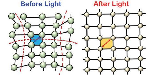 有机-无机钙钛矿太阳能电池中的离子迁移限制了器件的稳定性和性能。Nie等研究人员发现铯掺杂的三阳离子混合钙钛矿在1个太阳光照下暴露180分钟后,发生了均匀的晶格膨胀。晶格膨胀导致局部晶格应变的松弛,降低了钙钛矿-接触界面处的高能垒,有利于平面钙钛矿器件功率转换效率从18.5%提高到20.5%,且器件全光谱一个太阳照射下连续工作超过1500小时,高效光电器件的性能几乎无损害,这种光诱导的结构动力学对于理解钙钛矿光电器件的物理特性、器件性能和稳定性起着至关重要的作用。