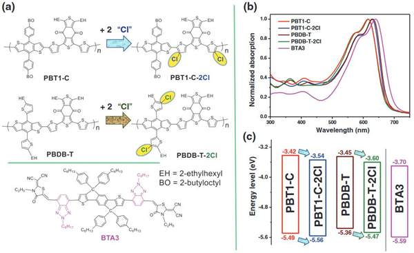 (a)PBT1-C、PBT1-C-2Cl、PBDB-T、PBDB-T-2Cl和BTA3的分子结构;