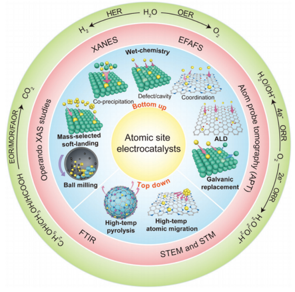 在这篇综述中,清华大学李亚栋和陈晨从对ASC的制造路线的系统综述开始,然后概述了一些精确探测原子结构的新型有效表征方法。然后,作者对一些典型的清洁能源反应的最新进展进行了全面总结:水分解,包括氢气分解反应(HER)和氧气分解反应(OER);氧还原反应(ORR),包括对H2O/OH–的选择性4e–-ORR和对H2O2/HO2–的2e–-ORR;甲酸,甲醇和乙醇(FAOR,MOR和EOR)的选择性电氧化。在本文的最后,作者给出了一个简短的结论,并讨论了进一步开发更具选择性、主动性、稳定性和低成本的ASC所面临的挑战和机遇。