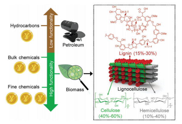 作为最大的可再生碳资源,木质纤维素生物质具有替代化石资源以生产高价值化学品(特别是有机含氧化合物)的巨大潜力。由于光激发的电荷载流子或光生的反应性物种所引起的独特的反应性物种和反应模式以及温和的反应条件,利用太阳能对木质纤维素生物质进行催化转化已引起了人们的广泛关注,因为该条件温和的反应条件可以使分子的精确裂解成为可能。靶向化学键或特定官能团的选择性官能化,而其他官能团则保持完整。