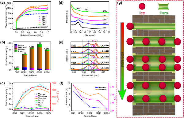 图2. CBC和CBCx的(a)氮气吸脱附曲线,(b)基于DTF理论的孔体积直方图,(c)不同孔径的孔体积、比表面积、KOH剂量间的相互关系曲线,(d)XRD谱线,(e)Raman光谱谱线,(f)原子占比、IG/ID值、KOH剂量间的相互关系曲线;(g)不同尺寸的孔中离子存储的模式。