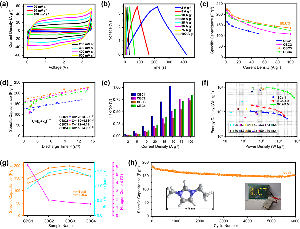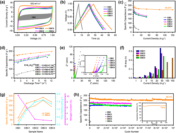 图3. SCs-1的电化学性能。(a)100 mV s−1时的CV曲线,(b)5 A g−1时的GCD曲线,(c)倍率性能,(d)比电容与放电时间平方根关系图,(e)电化学阻抗谱图,(f)电压降直方图,(g)比电容、孔体积、氮含量、KOH剂量间的相互关系曲线,(h)20 A g−1时的循环性能。