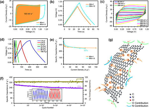 图4. SCs-1和SCs-1.2的电化学性能。(a)100 mV s−1时的CV曲线,(b)5 A g−1时的GCD曲线,(c)SCs-1.2不同扫描速率下的CV曲线,(d)SCs-1.2在不同电流密度下的GCD曲线,(e)倍率性能,(f)20 A g−1时的循环性能,(g)CBC3的储能机理示意图。