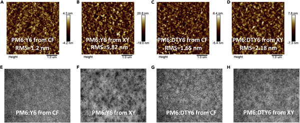 (E-H)不同溶剂加工的PM6:Y6和PM6:DTY6共混活性层薄膜的TEM图像。