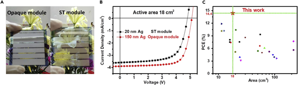 (C)文献报道的有效面积大于10 cm2的大面积不透明模组的PCE比较。