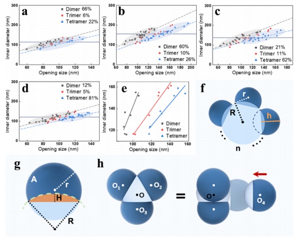 (c-f)TEM图像显示纳米碗的开口尺寸从二聚体到多聚体逐渐减小