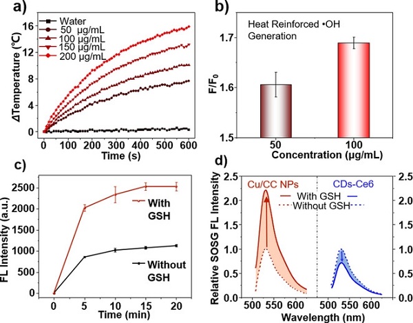 (c)在660 nm激光辐照下,有/无GSH加入时,Cu/CC NPs溶液与单线态氧检测探针(SOSG)反应的探针荧光强度随辐照时间的变化。