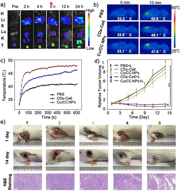 近日,中科院宁波材料所/江南大学林恒伟研究员(教授)等人通过简便组装光敏剂(Ce6)修饰的荧光碳点(CDs-Ce6)和Cu2+的方法,构建了TME智能响应型纳米平台,可用于荧光成像介导下的协同治疗。基于金属离子与CDs-Ce6的络合效应所制备的纳米组装体(Cu/CC NPs)展现出更适于血液长循环的尺寸(47.5 nm),并且表现出猝灭的荧光与光敏性能。当其暴露于TME的刺激中,Cu2+离子一方面能够与过表达的双氧水(H2O2)反应产生具有癌细胞杀伤力的羟基自由基(•OH)发挥化学动力学治疗(CDT)功效,另一方面能够和肿瘤组织中高浓度的谷胱甘肽(GSH)反应,通过消耗GSH达到增强细胞内活性氧(ROS)产生,放大氧化应激的目的。同时,Cu2+在反应中被还原为Cu+,与CDs-Ce6的络合能力减弱,在肿瘤微酸环境的作用下诱导组装体发生解组装,同时伴随着荧光性能与光敏性能的有效恢复及功能组分向肿瘤深组织的扩散。最后,通过细胞及动物层面的实验证明了Cu/CC NPs优异的协同治疗效果(PDT、PTT及光热增强的CDT)。该文章近日以题为“Tumor Microenvironment Stimuli-Responsive Fluorescence Imaging and Synergistic Cancer Therapy by Carbon- Dot-Cu2+ Nanoassemblies”发表在知名期刊Angew. Chem. Int. Ed.上。