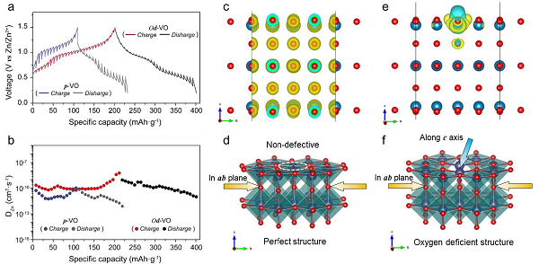图1.(a)和(b)的GITT曲线和计算得出的p-VO和Od-VO电极的Zn2+扩散系数,(c)和(d)分别为p-VO的电荷分布和相应的结构,(e)和(f)分别为Od-VO的电荷分布和相应的结构。