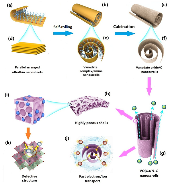 图2. V6O13-δ@C纳米卷的合成(a〜f)和结构(g〜k)的示意图,其中(g)具有快速电子路径的,富含缺陷的V6O13-δ@C纳米卷,(j)电解质易于渗透,且离子传输路径容易,(h)多孔壳和(i)由多孔碳基和小晶体组成的微结构。(k)用于高度可逆的Zn2+离子嵌入/脱嵌的缺陷晶体的示意图。