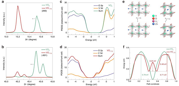 图3.(a-b)(200)和(-601)峰的计算出的XRD图的放大,显示了VO1.75与VO2的移动趋势,(c-d)VO2和VO1.75的态密度(PDOS)计算结果,(e)VO2和VO1.75中沿b隧道的锌离子扩散途径,(f)计算的VO2和VO1.75中的Zn离子扩散能垒。