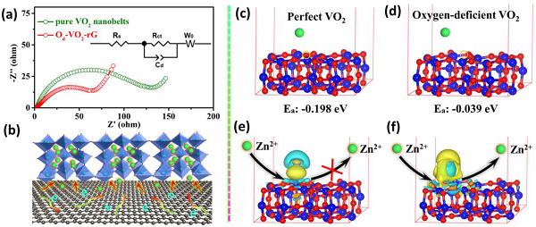 图4. 缺陷和异质结工程的协同效应(a)纯VO2纳米带和Od-VO2-rG电极在0.1 A g-1的3个循环后的奈奎斯特图和等效电路拟合;(b)界面处电子和离子转移的示意图; (c)完美的VO2和(d)氧缺陷Od-VO2的Zn2+吸附结构几何形状(侧视图);(e)完美的VO2和(d)氧缺陷Od-VO2的电荷密度和Zn2+脱嵌的示意图。